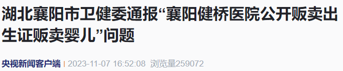 11月7日下午,襄阳市卫健委针对媒体反映“襄阳健桥医院公开贩卖出生证贩卖婴儿”问题作出的情况通报。