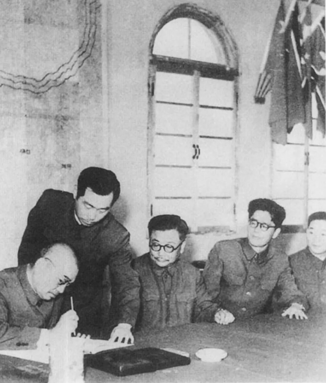 1953年,李克农陪同彭德怀(左一)在朝鲜停战协定上签字 。
