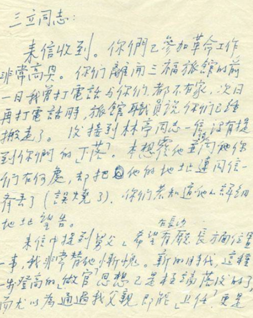 “三立同志:来信收到,你们已参加革命工作,非常高兴.....来信中提到舅舅“希望在长沙有厅长方面的位置”一事,我非常替他惭愧。新的时代,这种一步登高的“做官”思想已是极端落后了,而尤以通过我父亲即能“上任”,更是要不得的想法。新中国之所以不同于旧中国,共产党之所以不同于国民党,毛泽东之所以不同于蒋介石,毛泽东的子女妻舅之所以不同于蒋介石的子女妻舅,除了其他更基本的原因之外,正在于此。皇亲贵戚仗势发财,少数人统治多数人的时代已经一去不复返了。靠自己的劳动和才能吃饭的时代已经来临了。在这一点上,中国人民已经获得根本的胜利。而对于这一层,舅舅恐怕还没有觉悟。望他慢慢觉悟,否则很难在新中国工作下去。翻身是广大群众的翻身,而不是几个特殊人物的翻身。生活问题要整个解决,而不可个别解决。大众的利益应该首先顾及,放在第一位。个人主义是不成的。我准备写信将这些情形坦白告诉舅舅他们。 反动派常骂共产党没有人性,不讲人情,如果他们所指的是这种帮助亲戚朋友,同乡同事做官发财的人情的话,那么我们共产党正是没有这种“人情”,不讲这种“人情”。共产党有的是另一种“人情”,那便是对人民的无限热爱,对劳苦大众的无限热爱,其中也包括自己的父母子女亲戚在内。当然,对于自己的近亲,对于自己的父、母、子、女、妻、舅、兄、弟、姨、叔,是有一层特别感情的,一种与血统家族有关的人的深厚感情的。这种特别感情,共产党不仅不否认,而且加以巩固并努力于倡导它走向正确的与人民利益相符合的有利于人民的途径。但如果这种特别感情超出了私人范围并与人民利益相抵触时,共产党是坚决站在后者方面的,即使“大义灭亲”,亦在所不惜。 我爱我的外祖母,我对她有深厚的描写不出的感情,但她也许现在在骂我“不孝”,骂我不照顾杨家,不照顾向家;我得忍受这种骂,我决不能也决不愿违背原则做事,我本人是一部伟大机器的一个极普通平凡的小螺丝钉,同时也没有“权力”,没有“本钱”,更没有“志向”来做这些扶助亲戚高升的事。至于父亲,他是这种做法最坚决的反对者,因为这种做法是与共产主义思想、毛泽东思想水火不相容的,与人民大众的利益水火不相容的,是极不公平,极不合理的。 无产阶级的集体主义——群众观点与资产阶级的个人主义——个人观点之间的矛盾正是我们与舅舅他们意见分歧的本质所在。这两种思想即在我们脑子里也还在尖锐斗争着,只不过前者占了优势罢了。而在舅舅的脑子里,在许多其他类似舅舅的人的脑子里,则还是后者占着绝对优势,或者全部占据,虽然他本人的本质可能不一定是坏的。 关于抚恤烈士家属问题,据悉你的信已收到了。事情已经转组织部处理。但要有精神准备,一下子很快是办不了的。干部少事情多,湖南又才解放,恐怕会拖一下。请你记住我父亲某次对亲戚说的话:“生活问题要整个解决,不可个别解决。”这里所指的生活问题,主要是指经济困难问题,而所谓整个解决是指工业革命,土地改革,统一的烈士家属抚恤办法等,意思是说应与广大的贫苦大众一样地来统一解决生活困难问题,在一定时候应与千百万贫苦大众一样地来容忍一个时期,等待一个时期,不要指望一下子把生活搞好,比别人好。当然,饿死是不至于的。 你父亲写来的要求抚恤的信也收到了。因为此事经你信已处理,故不另复。请转告你父亲一下,并代我问候他。 你现在已开始工作了吧,望从头干起,从小干起,不要一下子就想负个什么责任,先要向别人学习,不讨厌做小事,做技术性的事,我过去不懂这个道理,曾经碰过许多钉子,现在稍许懂事了——即是说不仅懂得应该为人民好好服务,而且开始稍许懂得应该怎样好好为人民服务,应该以怎样的态度为人民服务了。