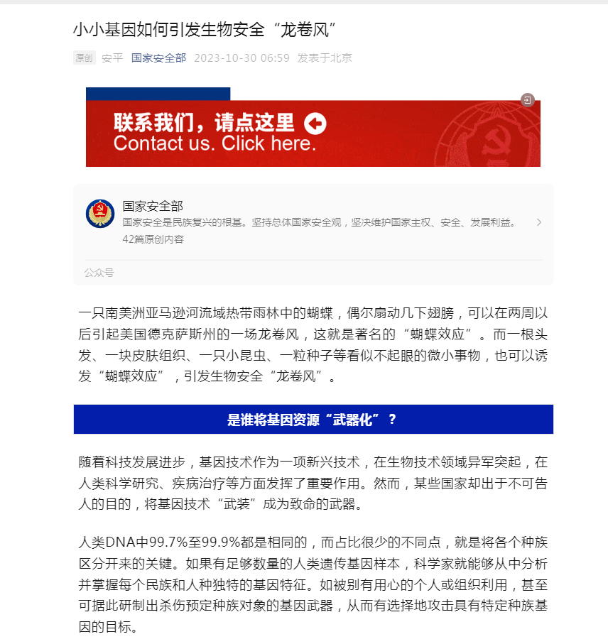 国安部近日发布的公号文字中,阐述了这个原理。因为人类的DNA99.9%相同,而就是这0.001不同,区分不同人种和民族。如果能掌握某人种的遗传基因,就能掌握一个民族或者人种的基因特点。如果想杀死这个民族或者人种,就可以研制出针对特定人种和民族的基因武器。