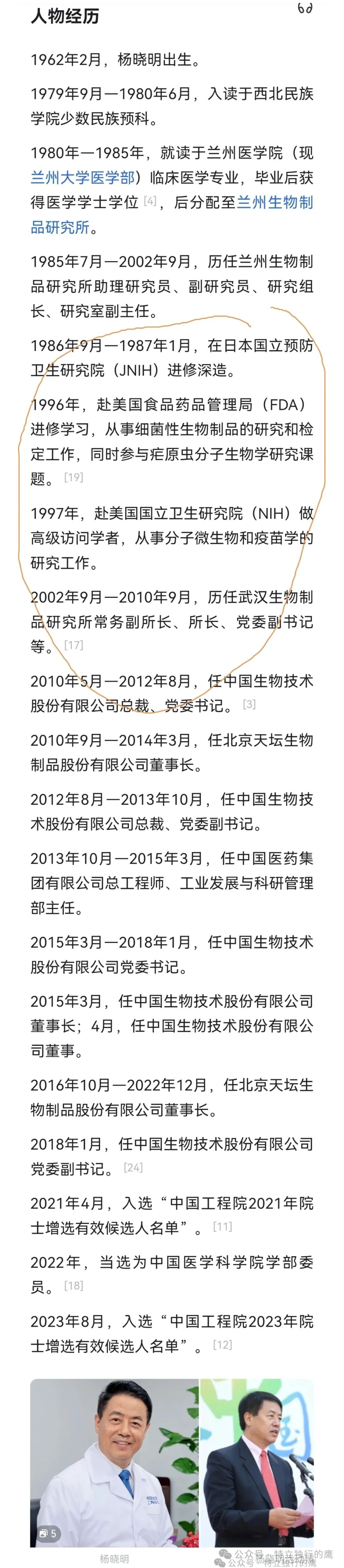 而在2002年9月到2010年9月期间,杨晓明在武汉生物制品研究所担任多个职务,包括常务副所长、所长和党委副书记等。