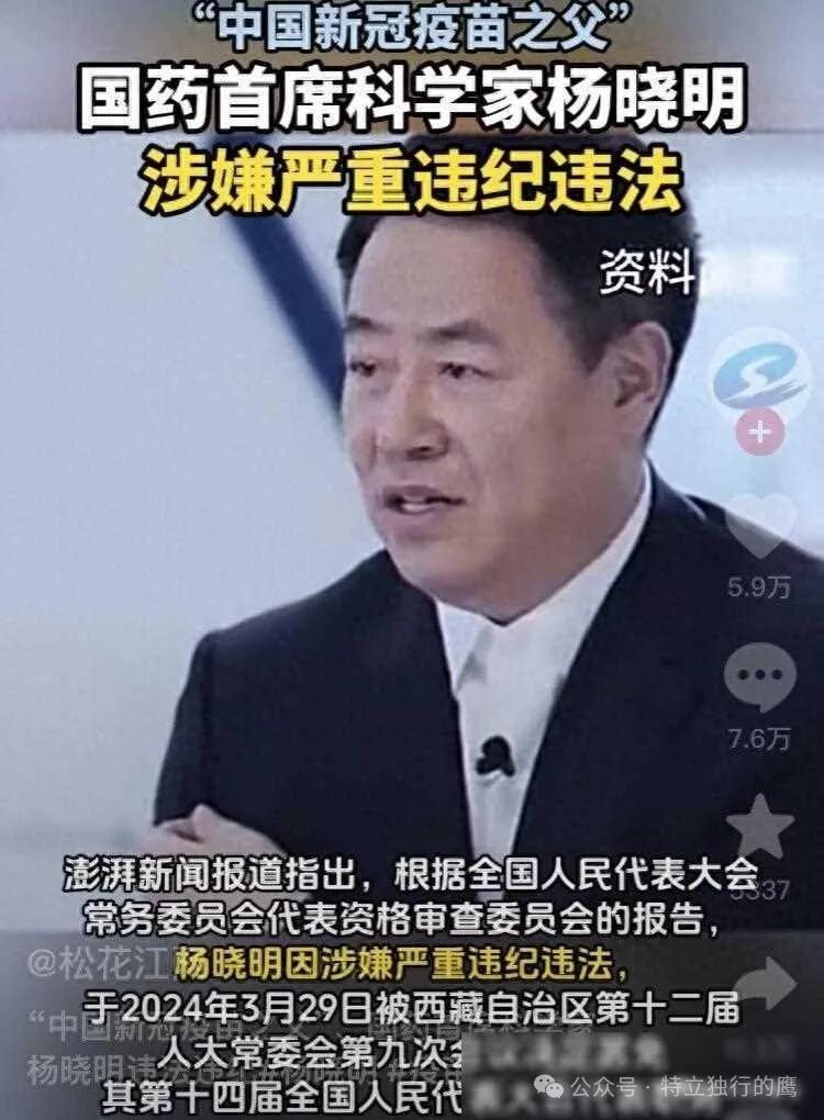 如果杨晓明查实美日几十年的培养且隐藏很深的间谍话,年在特定产品上存在不端行为,那么杨主导研发的疫苗对中国危害程度不仅仅浪费了七千亿,还有对打了其疫苗的国人生命健康有无法预料的后果,那将是对中国人民造成深重灾害。