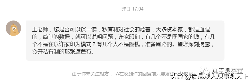 昨天,有位网友给我留言说:“王老师,您是否可以谈一谈,私有制对社会的危害,大多资本家,都是血腥的,简单的数据,就可以说明问题,许家印们,有几个不是圈国家的钱,有几个不是在以许家印为模式?有几个人不是圈钱,准备跑路的。望您深刻揭露,掀开私有制的那张遮羞布。”