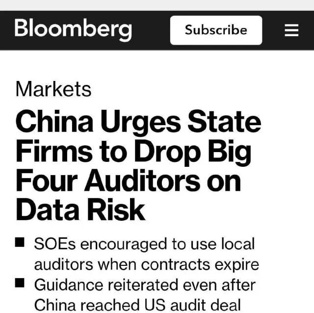2023年2月,国内财经媒体引述彭博社的报道称,中国对国有企业提出指导性意见,已要求国有企业逐渐停止使用四大国际会计师事务所,彭博社的解读是“保护大型国有企业的敏感信息,确保中国的数据安全”。
