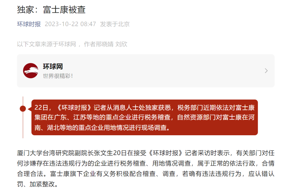 根据环球时报的报道,这次税务部门对富士康在广东,江苏的重点企业进行了税务稽查;自然资源部门对富士康在河南,湖北的重点企业用地情况进行现场调查。