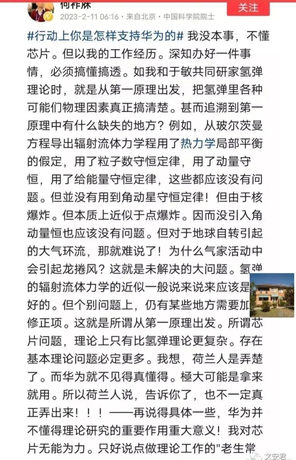 “所谓芯片问题,理论上只有比氢弹理论更复杂。存在基本理论问题必定更多。我想,荷兰人是清楚了。而华为就不见得真懂得。極大可能是拿来就用。所以荷兰人说,告诉你了,也不一定真正弄出来!再说得具体一些,华为并不懂得理论研究的重要作用,重大意义”。