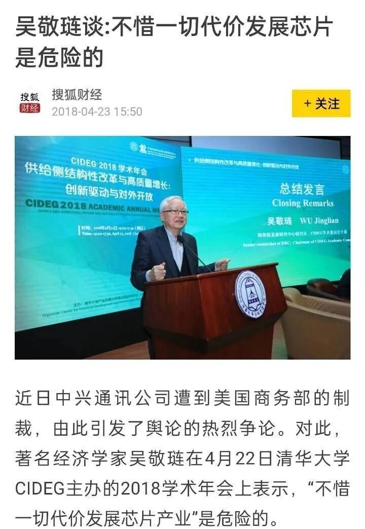 当初中兴通讯遭美国制裁后,经济学家吴敬琏在清华大学CIDEG主办的2018学术年会上表示,