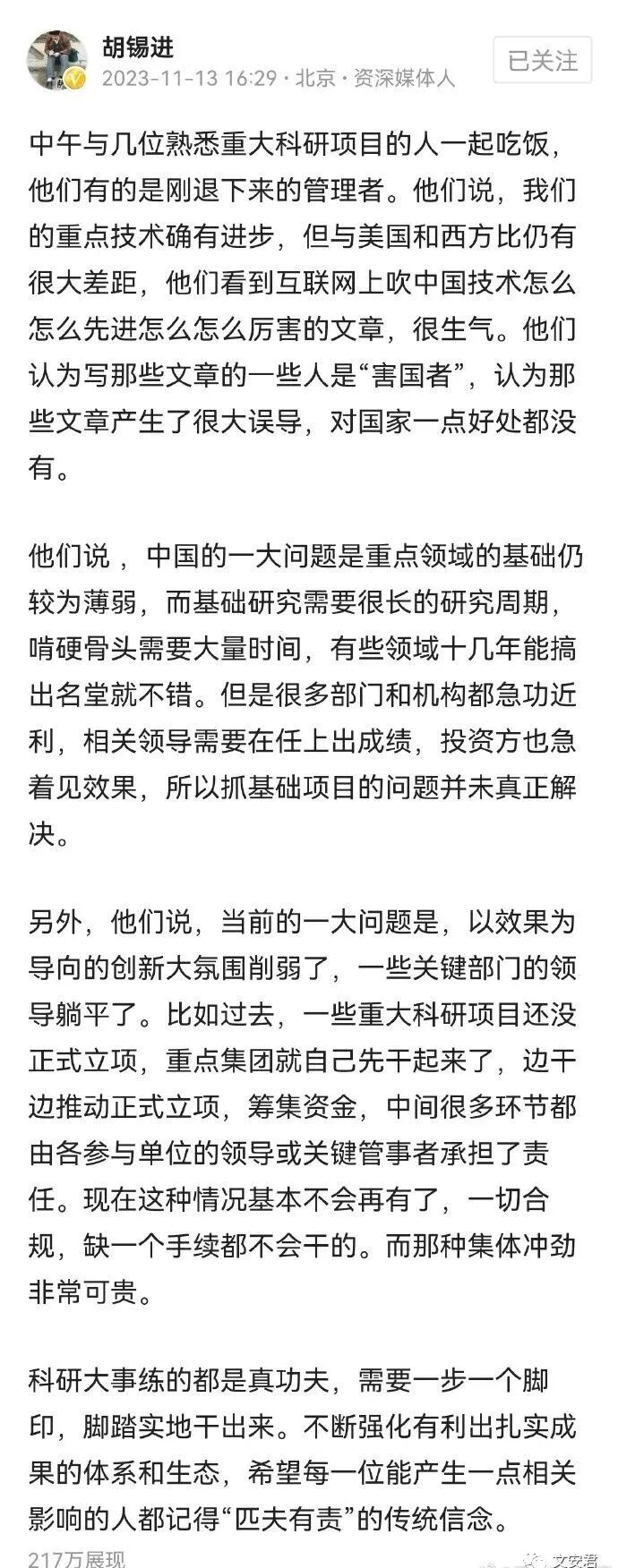 反而与这些退休老干部的不作为、无能、混课题拿经费、不干实事、水论文、尸位素餐……,有很大关系。除去历史欠账,我们也不说中国的科技水平到底是不是已经赶上来了、领先了,只聊一聊“吹”中国科技会不会拖中国后腿、会不会害国这一点。