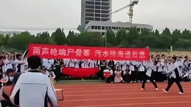 网传视频显示,一学生在椅子上发表讲话后,另一学生举起类似“手枪”物品对准讲话者,并上前“补枪”。后发言者做倒地状,旁人上前追堵“开枪者”。另有学生举起写有“两声枪响尸骨寒,污水排海遗后患”的横幅,围观者欢呼鼓掌。