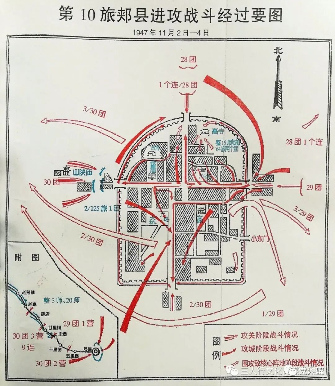 “清早,就听说敌人已经进了城,现在正向西攻击。我到北面四里的恋庄去谈材料,找到一连,他们给我找来了活捉武庭麟的战土常明礼,一连就是捉了三个师长的部队。”