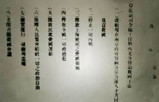 1936年12月12日爆发的西安事变,对中国历史的发展进程产生了重大影响。蒋介石是当时中国的最高统帅,被扣之后,举国哗然。是日上午,由张学良、杨虎城领衔向全国发出通电,解释发动西安事变的原委,提出八项救国主张: