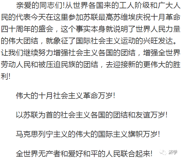 1957年11月6日下午4时,十月革命40周年庆祝大会在卢日尼基体育馆继续举行,各社会主义国家代表团团长致词。第一个致词的是毛主席。毛主席一出场,全体与会者起立致敬,讲话中掌声不断,讲完后全场再次起立,长时间地鼓掌致敬。