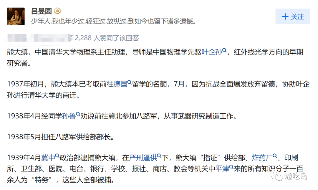 那个春秋笔法回答的后半部分又讲到,建国后,熊大正在清华的导师叶企孙(也是当年支持他去八路军的人)要求为他平反,却又因此遭到残酷迫害摧残身体,最终于1977年去世。