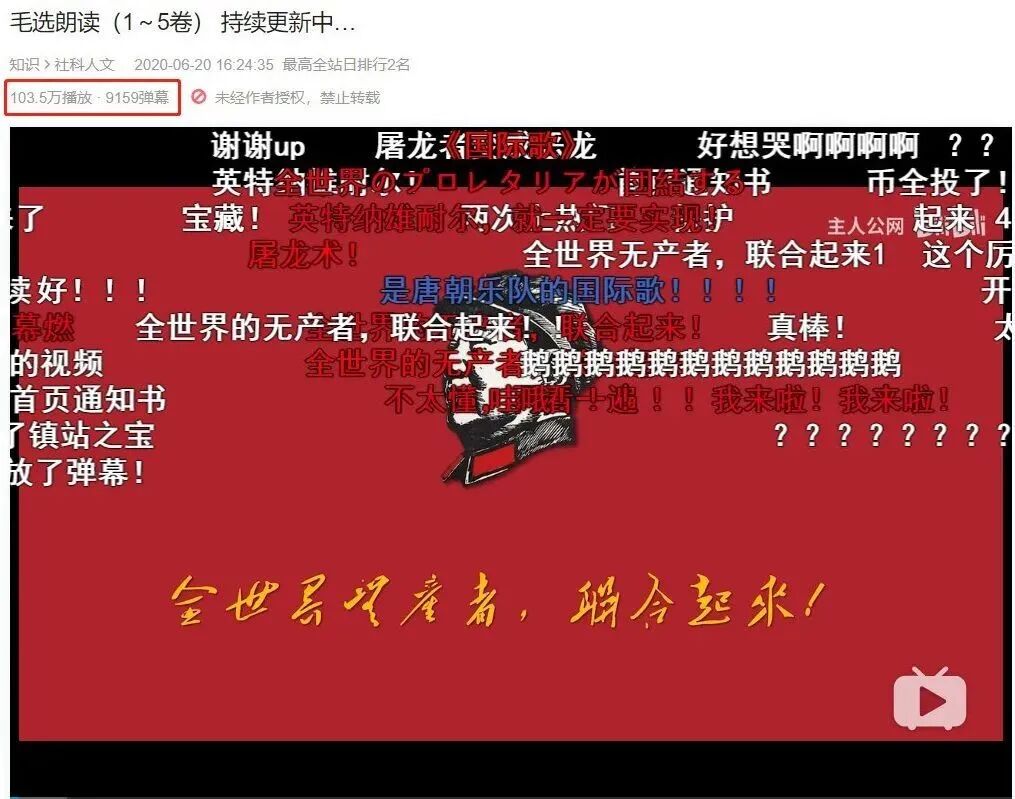 在以二次元文化著称的B站上,朗读毛选的视频上过推荐首页。有的视频播放量轻松突破百万。而更让网友惊喜的是,这样的视频,弹幕没有关,评论没有关。听毛选,刷弹幕,成为他们读毛选的新姿势。