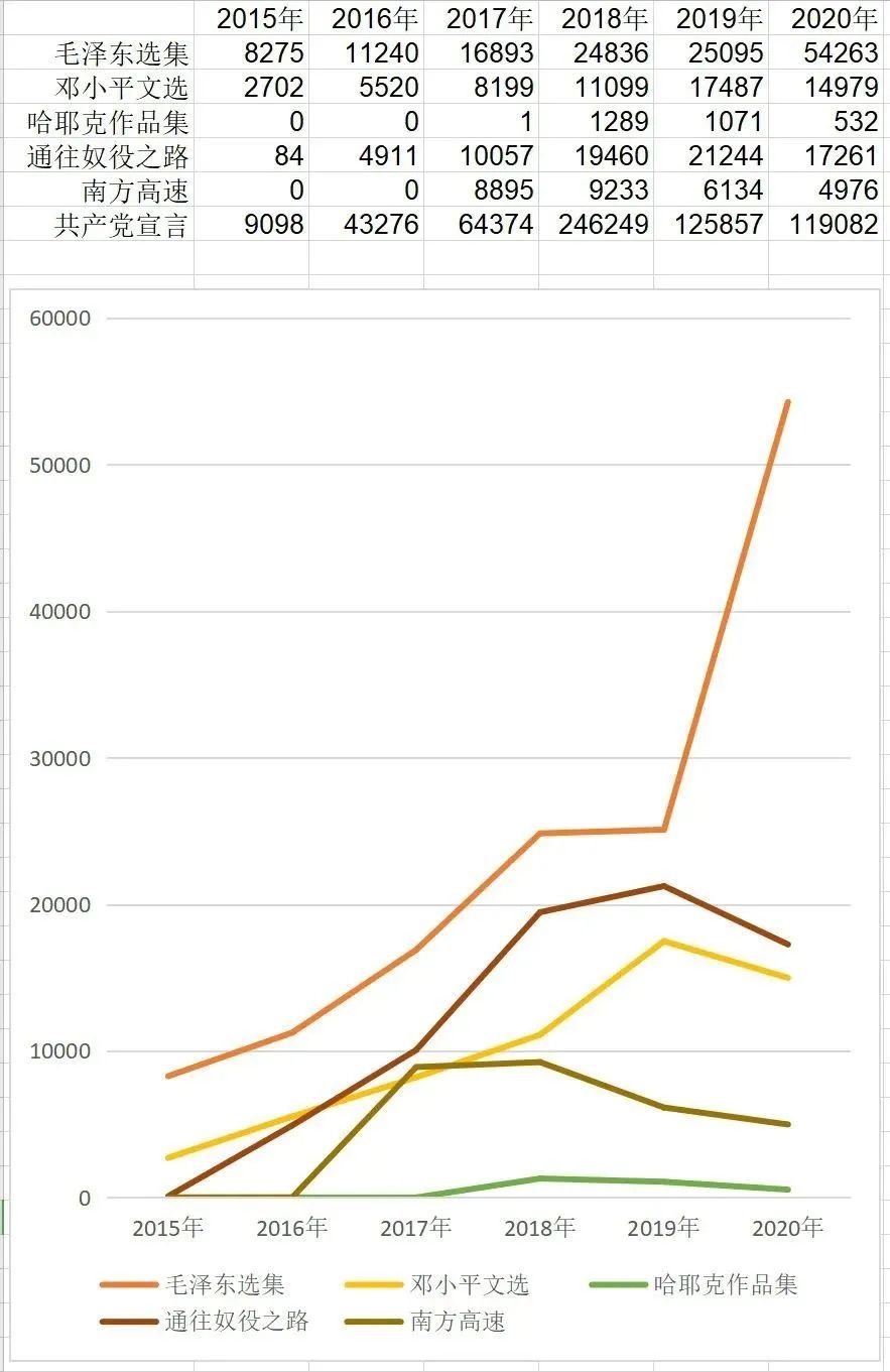 据某出版社统计数据,自2015年起,5年间《毛选》销量逐年递增,2020年销量更比去年翻了一倍。