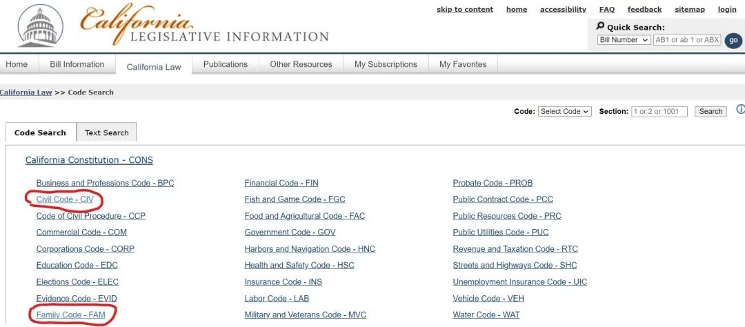 (加利福尼亚立法官网页面截图,红线部分显示其《民法典》和《家庭法典》是分开的两部法典)