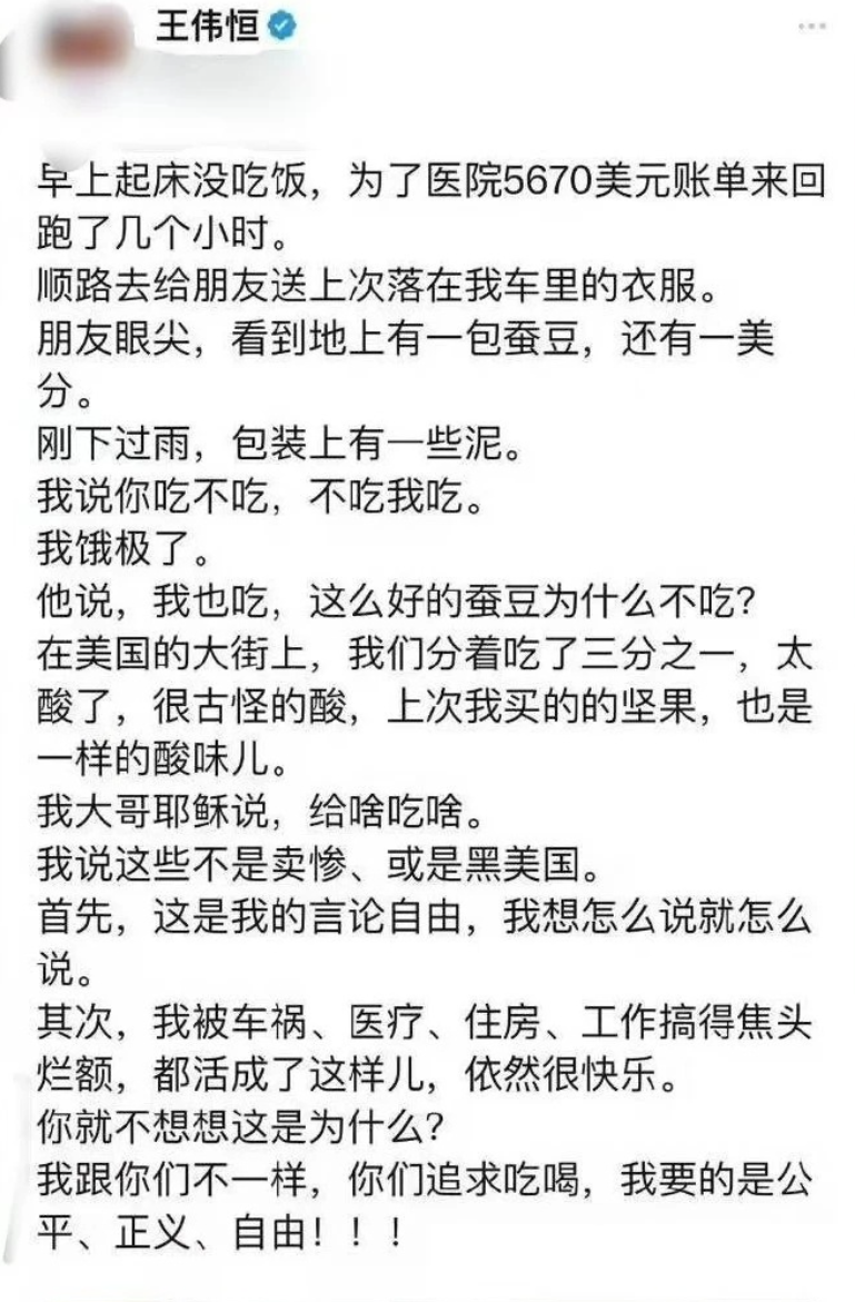 当初,王伟恒变卖房产,从一个生活不错的中国中产,变身为一无所有的美洲猪仔,从南美走线到北美,撕掉护照,得意洋洋显摆自己打黑工、露宿街头,甚至公然自称“纯血汉奸”,都体现了这一点。他是在努力证明自己“选择正确”!