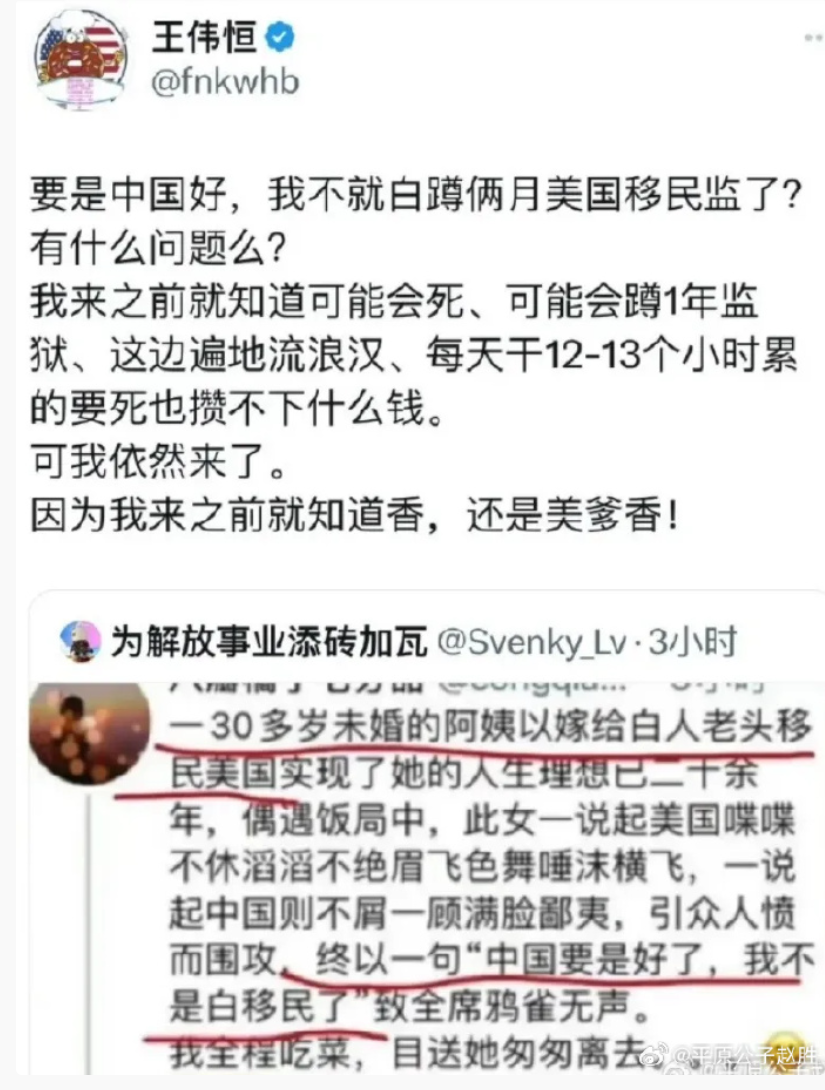 他以一己之力,摧毁了美国“一美元炸鸡”、“流浪汉都过的很好”的光辉形象,自己也成为了赫赫有名的“电子宠物”。大家回顾一下,某些莫名其妙的恨国党、殖人,是不是都有类似的经历?明明可以过不错生活的,他们非要追求一夜暴富,比如akid和甜甜圈,都是负债累累的币圈赌狗;明明可以安居乐业做个正常人的,偏偏要违法犯罪,和公序良俗过不去,比如那个和邻居打架打坏邻居一只眼的画家老太太,比如和幼儿园过不去的王伟恒……一个走线去南美,一个居然一把年纪游过墨西哥河。这帮人还特别容易信教,比如王伟恒和范士贵,都信基督教,无论做出多么丧心病狂的事情,遭遇多么悲催的命运,他们都能找到接口,说成是“遵循主的指引”。你会发现,这群人身上有着很多共同点,最像的一点就是,他们的性格情绪都极不稳定,或许某些时候可以很成功,但他们守不住这份成功,他们往往还把时代的红利、平台的力量,当做自己本人的力量,自命不凡……只要稍有不如意,就会破罐子破摔,他们把自己性格和道德缺陷所导致的悲剧,都归咎于社会,于是妄想远方有个自己的“地上天国”,不远万里倾家荡产也要去投奔,纵做鬼,也幸福。说白了,这帮人就是不甘,不甘做个普通的劳动者,他们不是追求自由,而是追求暴富、特权和优越感……就像他们当年在知乎指点江山装X一样。还是那句话,这些人在任何一个世界,都将成为人人鄙夷的垃圾。在美国人看来,他们根本就不是合格的劳动力,他们甚至不如那些切西兰花的墨西哥人。无论他们曾经学历有多高、生活有多好,他们都是垃圾。因为他们自私到把自己看成了宇宙的中心,把其他人都看成了小怪和NPC。更因为他们无能,他们四体不勤,五谷不分,没有任何自我生存的经验,他们对自己的废柴程度还一无所知,总想着不劳而获。所以,他们的思想,配得上他们的苦难。