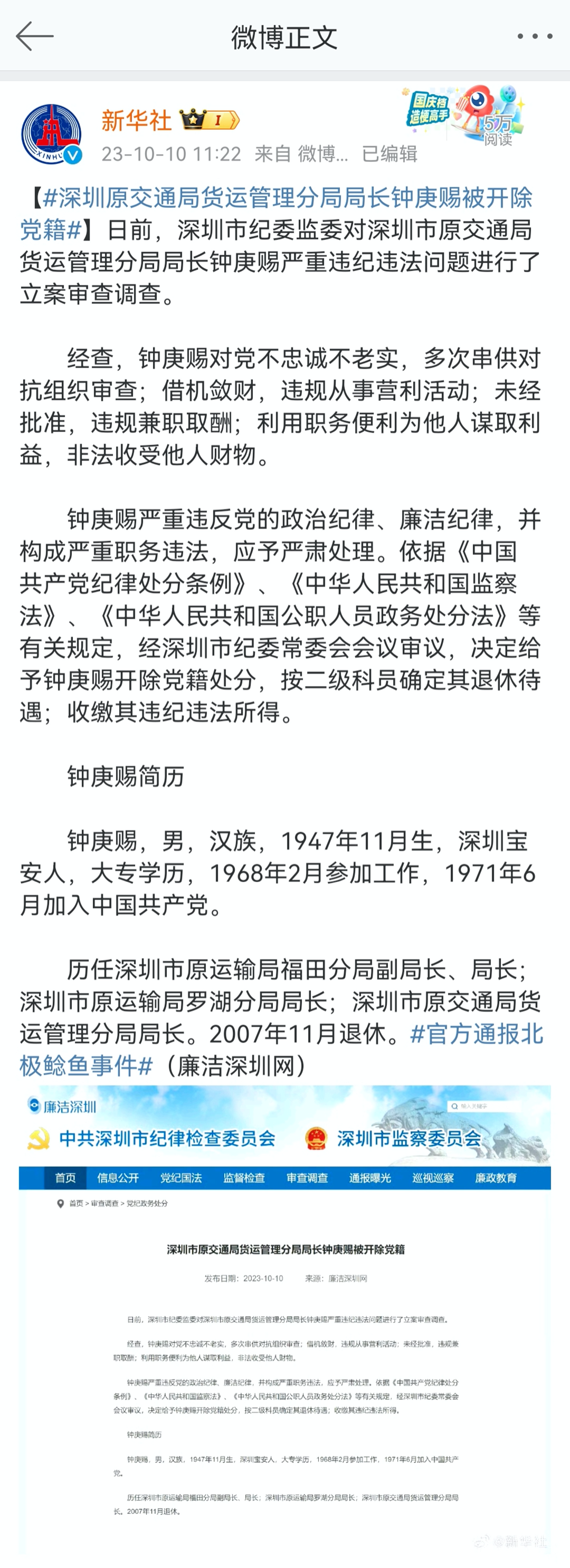 “北极鲇鱼”的爷爷,原深圳市交通局货运管理分局局长钟庚赐的调查结果今天公布,深圳市纪委监委给予钟庚赐开除党籍处分,按二级科员确定其退休待遇;收缴其违纪违法所得。