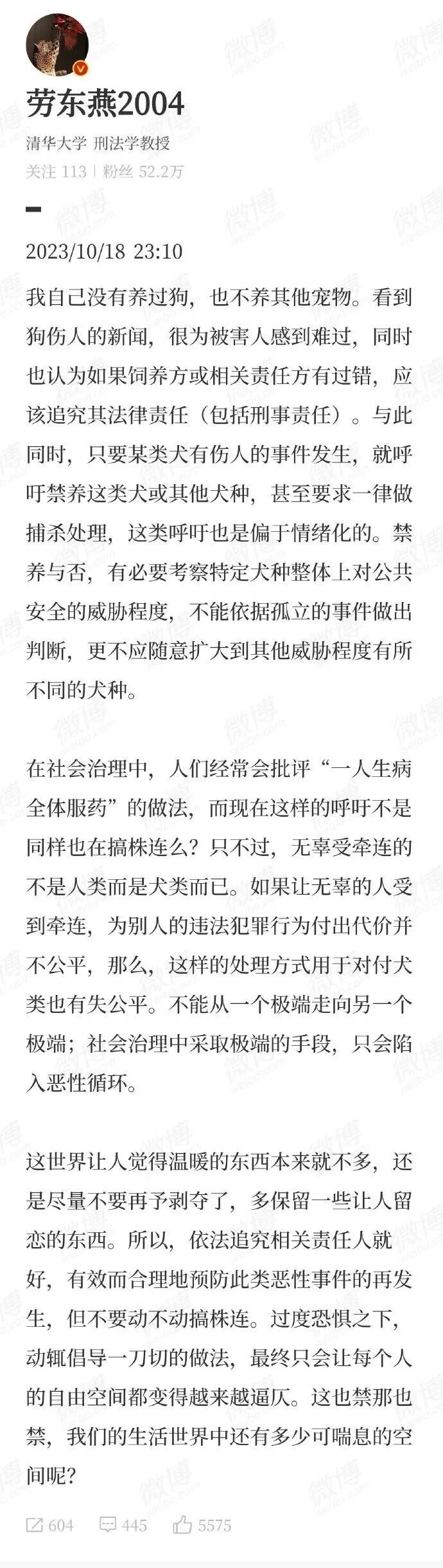 此事引发宠物管理的讨论。10月16日以来,全国多地宣布将加强养犬管理工作。10月18日,清华大学刑法学教授@劳东燕2004 发文称:看到狗伤人的新闻,很为被害人感到难过,同时也认为如果饲养方或相关责任方有过错,应该追究其法律责任(包括刑事责任)。与此同时,只要某类犬有伤人的事件发生,就呼吁禁养这类犬或其他犬种,甚至要求一律做捕杀处理,这类呼吁也是偏于情绪化的。这样的处理方式对犬类也有失公平,不能从一个极端走向另一个极端。所以,依法追究相关责任人就好,有效而合理地预防此类恶性事件的再发生,但不要动不动搞株连。