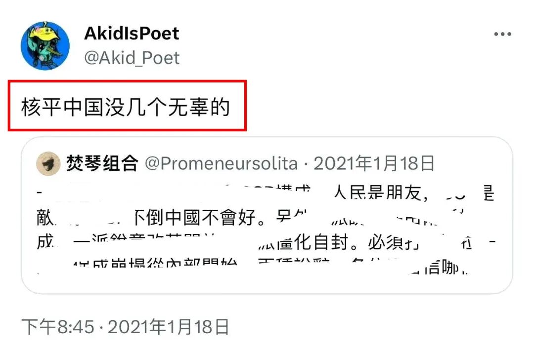 在她快要饿死的时候,仍在极其恶毒的叫嚣要“核平中国”,又一次叫嚣“没几个无辜的”。