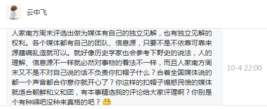除了直接激烈咒骂我和我母亲的,也有南方系铁粉发“长评”要求精选出来“让读者评评理”,如果我不敢精选,就是“瞎嘚吧,实际没种。”