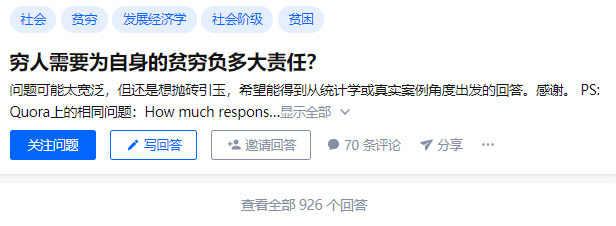 知乎还有个大热的帖子,叫“穷人需要为自身的贫困负多大责任”,里面有部分言论和思想,让人震惊。