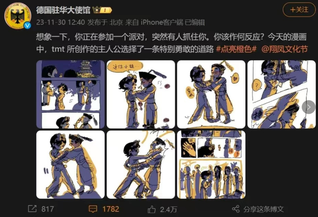 这两幅漫画,不但无底线丑化中国形象,把中国描绘成一个没有人权、没有自由的世界,还煽动男女对立,污蔑中国压迫、侮辱、屠杀女性,还直接喊出“点亮橙色”,这一套手法,活脱脱就是煽动“颜色革命”的标准模式。这两幅漫画的作者,很明显都是黄皮肤的帝国主义走狗,因为只有他们懂这种无耻下作的套路。这个所谓的“翔凤文化节”,名字叫得好听,实际上就是一场“打拳节”,煽动男女对立,制造性别矛盾。“倡导女性权利”没问题,但是他们为什么不先管管美国自家女性权利问题?要知道,美国至今还是个大部分州童婚合法的国家,在很多州不能合法堕胎的国家……你TM真关心全世界的“人权”、“女权”,先把美国扬了吧,美国44个州童婚合法,某些州支持一夫多妻,10岁女孩被强奸怀孕还不能堕胎,危地马拉移民在集中营被割子宫……美国每年有约46.3万名妇女遭到强奸,相当于每一分钟,就有一名妇女遭到强奸,怎么就没有人关心美国女性的“人权”呢?美国女人就不是人?中国女性的权利,和美国女性的权利相比,那简直就是一个在天堂,一个在粪坑。它们不关心自己国家的女性,天天假惺惺“关心”别国的女性,跑到别的国家资助“打拳”,煽动男女对立,制造撕裂和对立。
