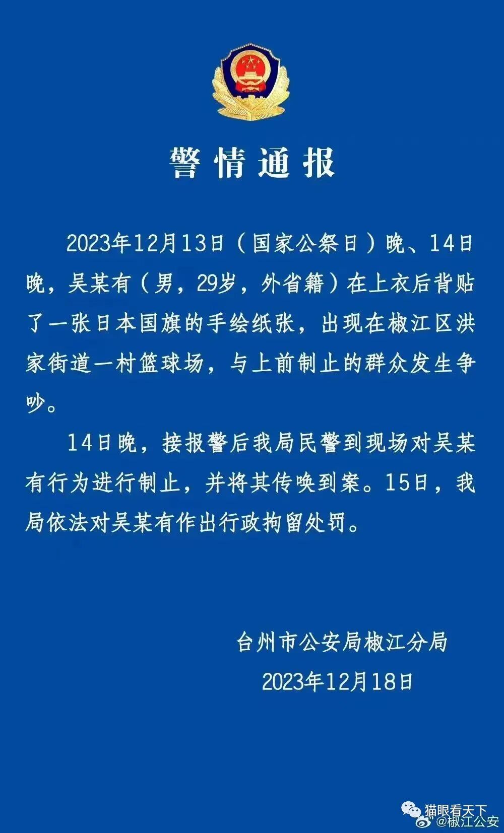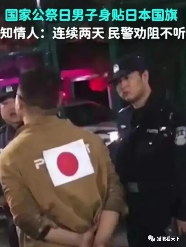 就在12月13日国家第十个公祭日当天,浙江台州一男子在外套背上贴了一张手绘的日本国旗,背着双手旁若无人走在街上,还不时环视周围的人,似乎在向公众宣告着他内心某种邪念。