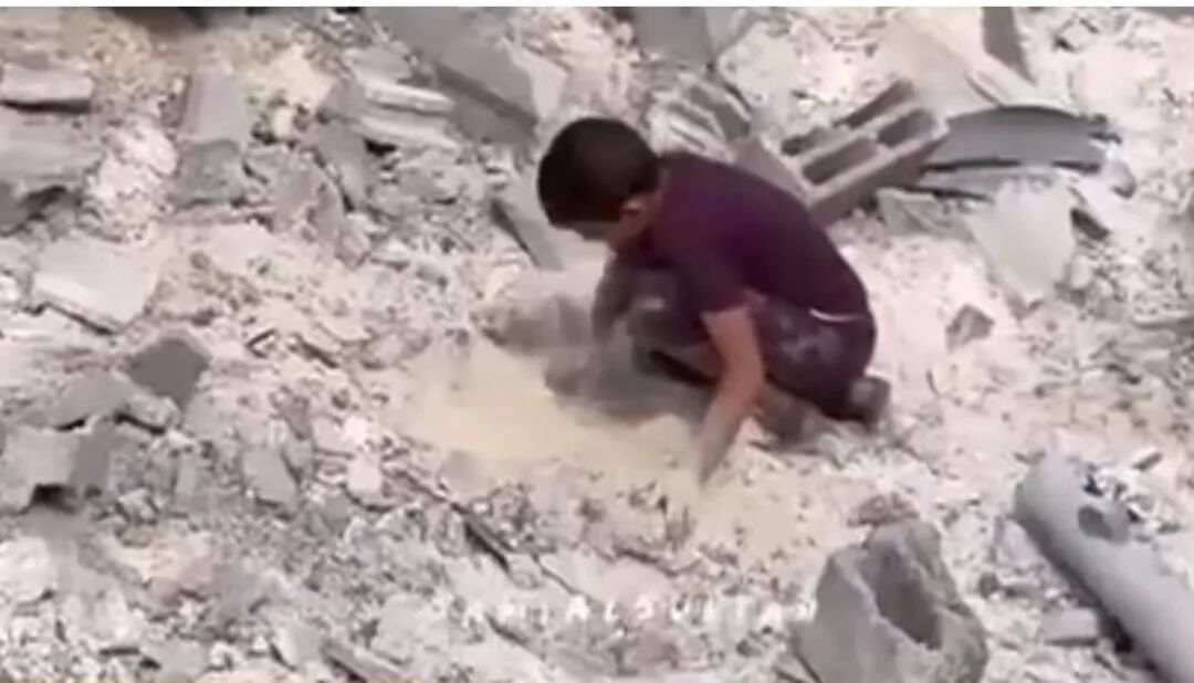 第三个视频,一个小男孩,跪在地上,用手在一片瓦砾中不停地挖,想必是因为他的父亲或母亲被埋在这片瓦砾下。