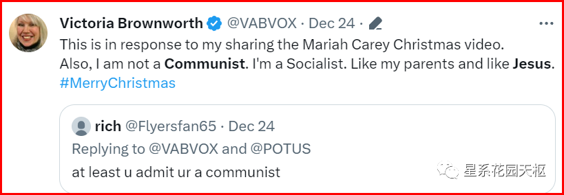 她写道:“在圣诞节的故事中,基督出生在现今的巴勒斯坦地区,受到(当时的)政府对无辜者进行大规模种族灭绝的威胁。”…“而数千年后,右翼势力正在暴力占领伯利恒,今天的巴勒斯坦人也遭遇了类似的悲惨故事,以至于伯利恒的基督教社区出于安全和尊重,取消了今年的平安夜庆祝活动。”(她这样解释,是为了暗示以色列不断炸教堂、以及迫害和排斥当地的基督徒)