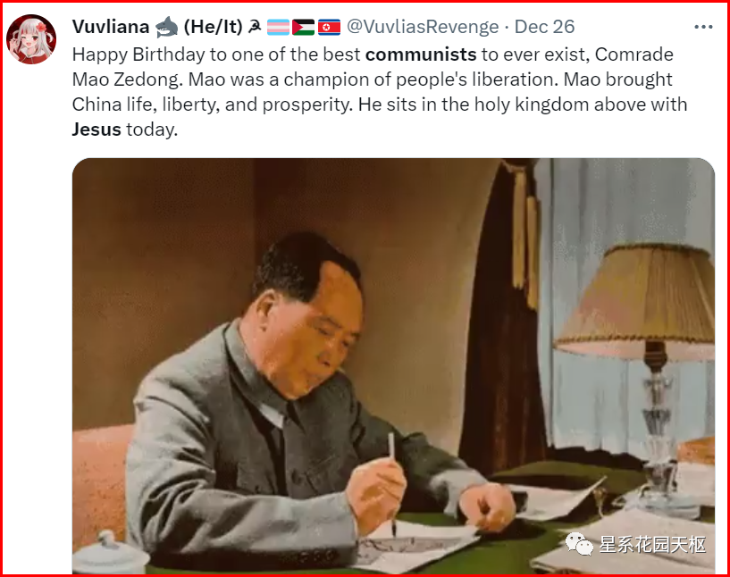 更有网友在美国圣诞节/中国教员节(因为地球自转这其实是同一时间)的时候,写下了教员如何解放东方巨人,为人民带来自由并(在神的国度)与耶稣坐在一起。