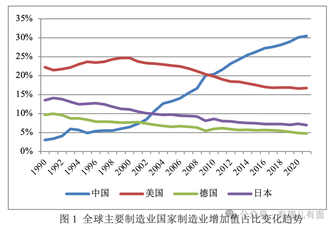1990年,美国制造业增加值占全球制造业增加值的比重为22%,2021年降至17%。