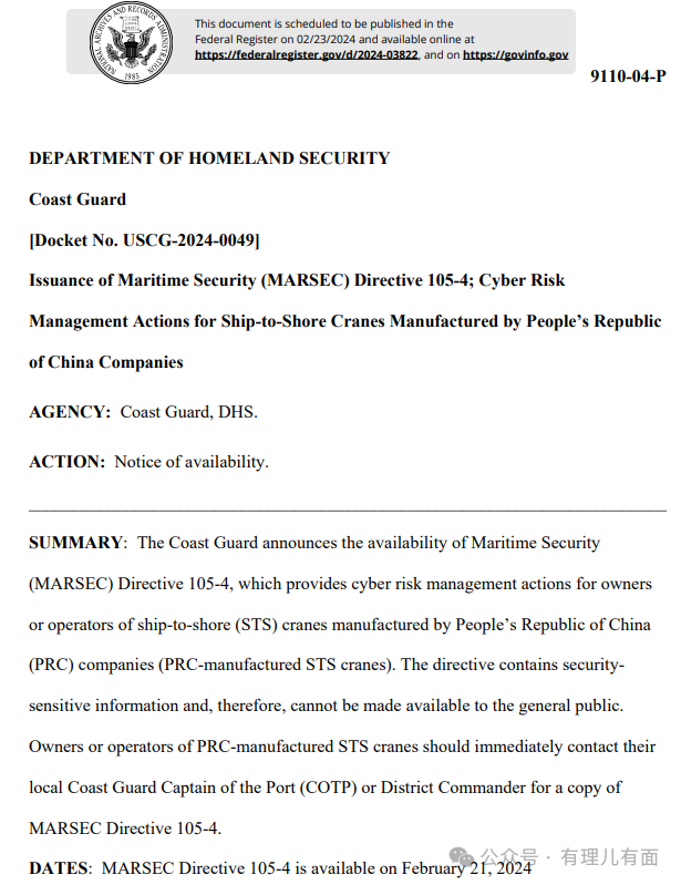 于是,美国海岸警卫队紧跟着宣布,中国制造的集装箱龙门起重机的所有者或运营商需要领取一份“海上安全指令”105-4的副本,该指令详细说明了与起重机相关的必要网络风险管理措施。