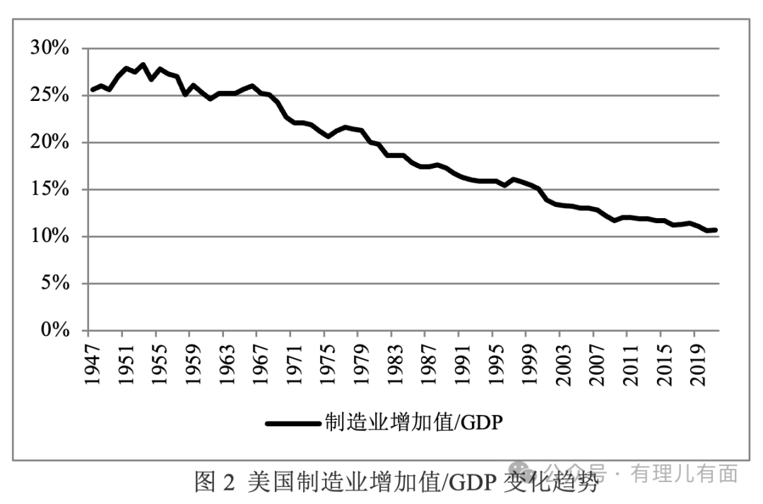 美国制造业增加值占GDP的比重持续下降。20世纪50年代初期,美国制造业增加值/GDP约为28%,2021年降至11%。