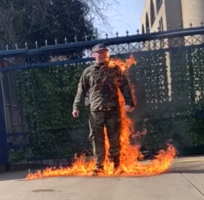 最后,他高喊“我将不再是这场种族灭绝的同谋”(“I will no longer be complicit in genocide”),以及“自由巴勒斯坦”的口号,将一瓶液体浇在自己的身上,然后点燃。