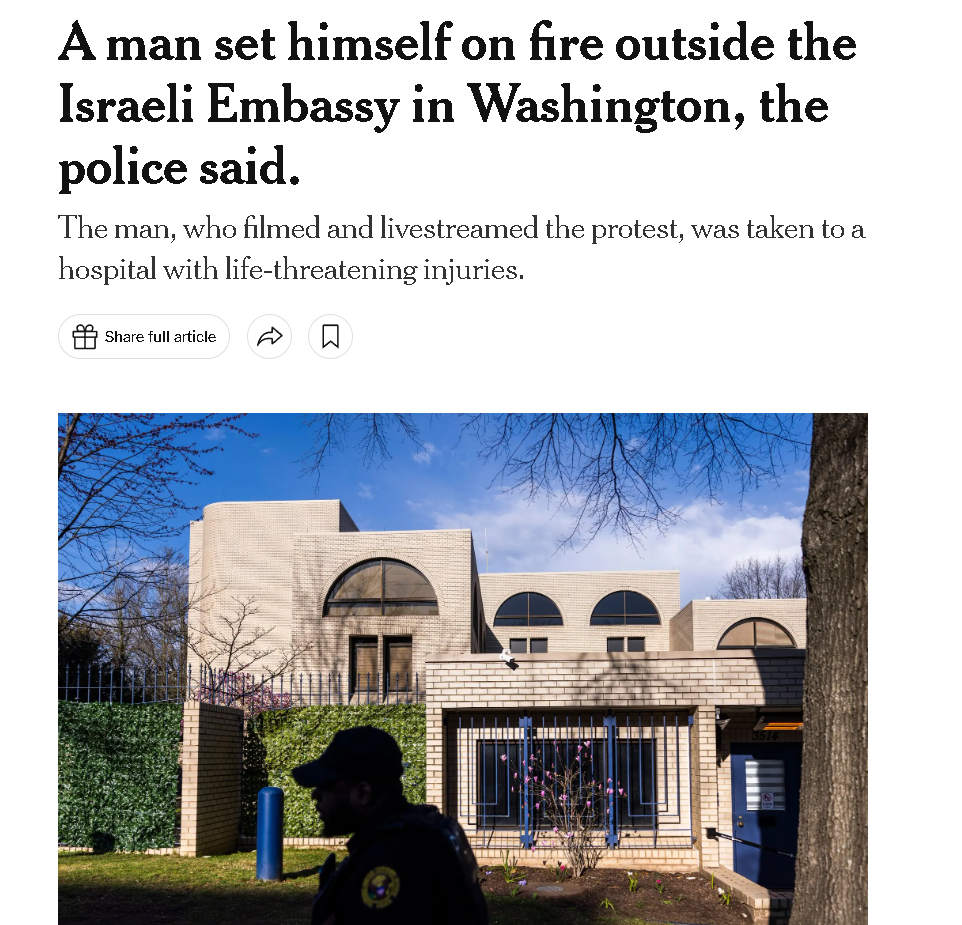 然后就是神奇的一幕,对于一名美国空军现役军官为了谴责以色列在加沙对巴勒斯坦人实施种族灭绝罪行、为了谴责美国政府做以色列的同谋而不惜自焚,美国媒体表现出了强大的自律性、纪律性,不约而同的只报道称一名美国男子采取极端方式,对于该男子是一名美国空军现役军官避而不谈。