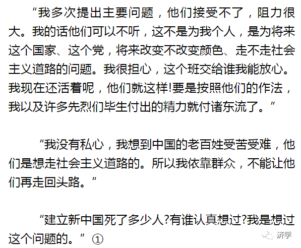 “我没有私心,我想到中国的老百姓受苦受难,他们是想走社会主义道路的。所以我依靠群众,不能让他们再走回头路。”