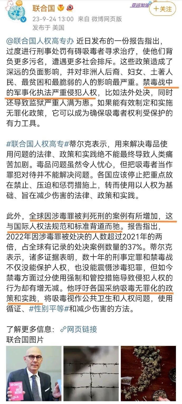 最后联合国官方微博通过“联合国人权高专办”之口呼吁“吸毒无罪化”,甚至于还特意说了什么“性别平等”。