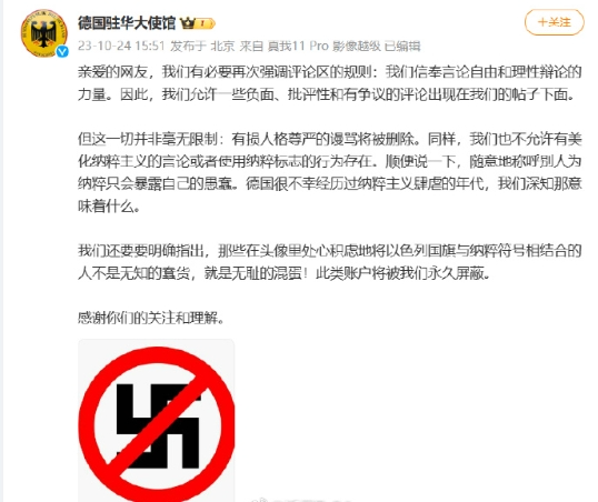 10月24日下午,德国驻华大使馆发贴,在声称“不允许有美化纳粹主义的言论或者使用纳粹标志的行为存在”之时,居然公然侮辱中国网民“愚蠢”。