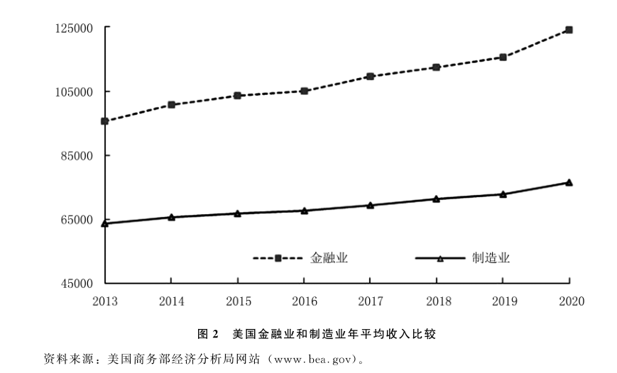 美国的统计数据也同样印证了上述研究,如图2中的数据所示,2020年美国金融业从业人员的年平均税前薪资为12.41万美元,制造业的年平均薪资则为7.64万美元。2013年金融业从业人员的年平均薪资约高出制造业50.21%,然而到了2020年,金融业年平均薪资收入则高出制造业62.43%。可见,曾经助推美国经济快速发展的制造业,从业人员的年平均薪资明显低于金融行业的收入水平,并且这种差距仍在持续扩大。
