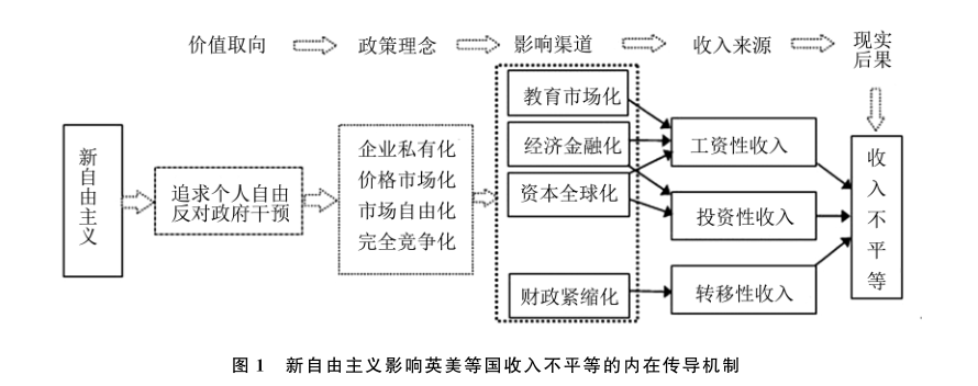 其中,教育市场化导致私人资本参与教育资源分配,使得不同阶层面临不平等的受教育机会和就业机会,加剧了收入不平等状况;经济金融化的过度发展,则导致实体经济不断萎缩和劳动收入比重下降,加剧了收入不平等;在资本全球化过程中,资本家和普通劳动者在资源占有配置方面的巨大差异,导致双方面对截然不同的收益来源和增加收入的机会,从而使劳资之间的收入差距进一步扩大;财政紧缩化则减少了用于转移支付的社会福利开支,扭曲了不同收入群体的税收负担,不但影响低收入人群的转移性收入,而且使其不成比例地承担了公共债务负担,进而加剧了英美等国的收入不平等状况,且并未产生新自由主义所信奉或许诺的“涓滴效应”。