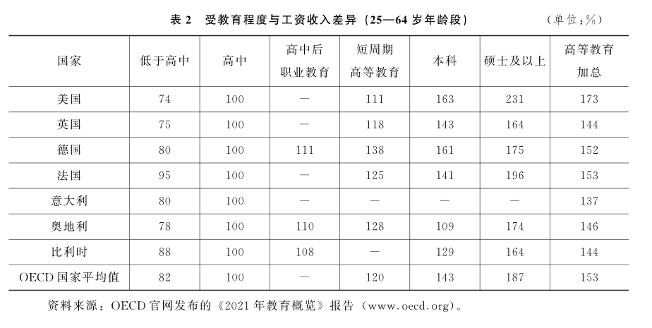 另外,英美等国的调查统计数据所表现出的情况与前述研究成果的结论也是完全一致的。表2中的数据反映了OECD部分成员国不同受教育程度就业人员的工资收入差异情况,这份调查报告中的数据显示,美国接受过高等教育的全职工作人员的平均收入是仅有高中学历的工作人员的2.31倍,接受过硕士及以上高等教育的全职工作人员的平均收入比仅有高中学历的工作人员高131%,但高中以下学历者的平均收入则要比仅有高中学历的工作人员低26%;英国接受过硕士及以上高等教育的全职工作人员的平均收入比仅有高中学历的工作人员高64%,但高中以下学历者的平均收入则要比仅有高中学历的工作人员低25%。从OECD成员国的平均值来看,具有任一高等学历的全职工作者,其平均收入比仅有高中学历的工作人员高53%,且高中以下学历者的平均收入比仅有高中学历的工作人员低18%。在经济相对欠发达的国家,这种因受教育程度不同导致的收入差距会更大。由此可见,当英美等国在新自由主义影响下出现普遍的教育不公平现象,收入不平等扩大就不可避免。