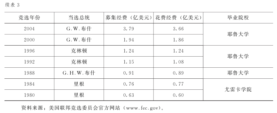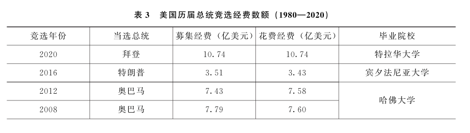 表3为1980年以来美国历届当选总统的竞选花费数据。实际上,部分当年未当选的参选人的竞选花费甚至大幅超过了当选总统。比如,2016年当选总统特朗普在竞选过程中共花费超过3.43亿美元,但其竞选对手希拉里的参选花费则高达5.86亿美元。从这些数据可以看出,新自由主义标榜的市场化自由竞争在英美等国的政治选举中,完全以财富与权力之间的交易得以体现。