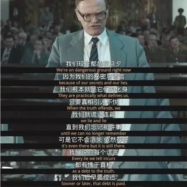 “我们现在危在旦夕,我们就是秘密和谎言的化身,只要真相引人不悦,我们就谎话连篇,我们说的每个谎言,都有愧于真相,我们迟早要偿还”。
