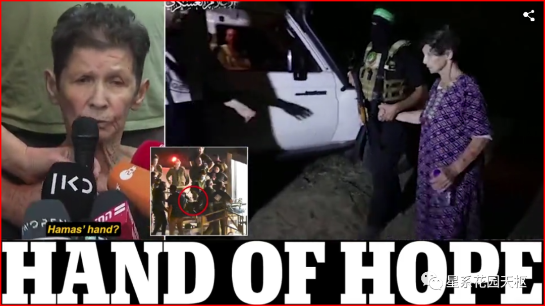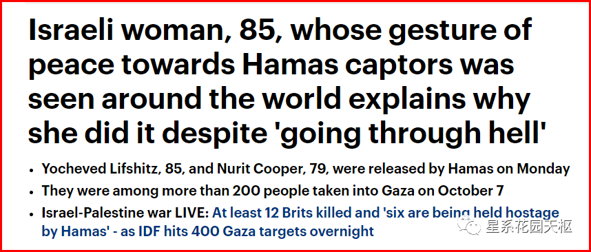 这个老太太,还有她的老伴,其实这几十年来都在反对以色列右翼的法西斯行径,所以,这很可能是她被提前放回来的原因之一。当然,另一个原因就是哈马斯要分出许多人力资源来照顾老人显得很不明智,还不如把他们送回来。这些老人,其实并不是那些狂热的内塔尼亚胡支持者,恰恰相反,他们居住在与世隔绝的基布兹,希望建设梦想中的共产主义集体农庄,却不幸被这场战争给打搅了。这确实非常可悲,但从老太太的发言来看,她对哈马斯的讨厌程度远不及对本国右翼总理和军方的,显然,这段访谈肯定点燃了英语媒体圈。