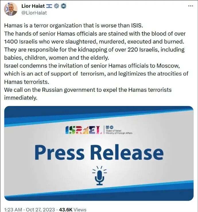 六、以色列要求俄罗斯驱逐哈马斯访问代表团,声称这将会被视作支持“恐怖主义”的行为。