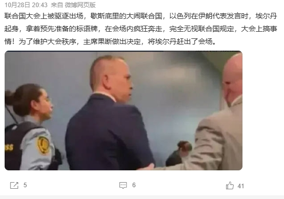 以色列还有更疯狂而不顾体面的事儿。联合国大会上在伊朗代表发言时,以色列代表埃尔丹拿起提前准备好的标语牌,无视联合国大会的规则、规定在会场内游走,试图破坏伊朗代表的发言。