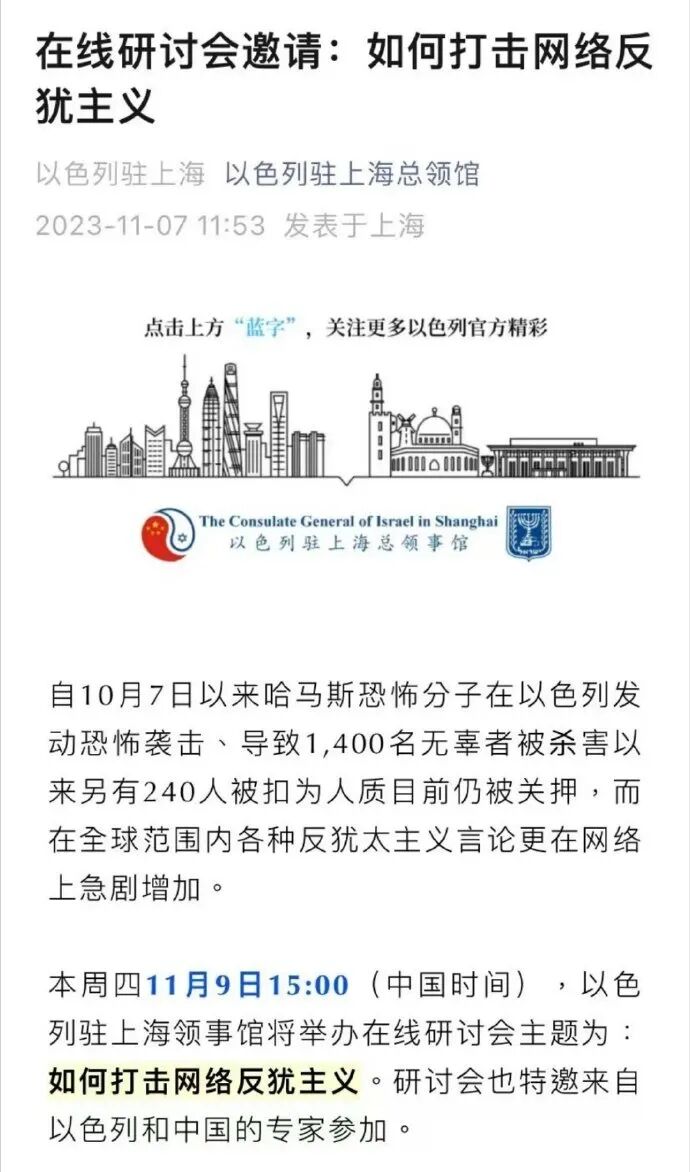 “以色列驻上海总领馆”在文章中声称“各种反犹太主义言论更加网络上急剧增加”,指要在11月9日15时举办在线研讨会,主题是“如何打击网络反犹主义”,要邀请中国的专家参加。