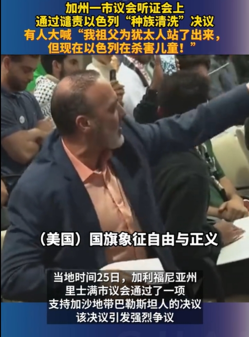 美国内部,也是越来越多的声音反对以色列。甚至美国加州一市还通过了谴责以色列“种族清洗”的决议。
